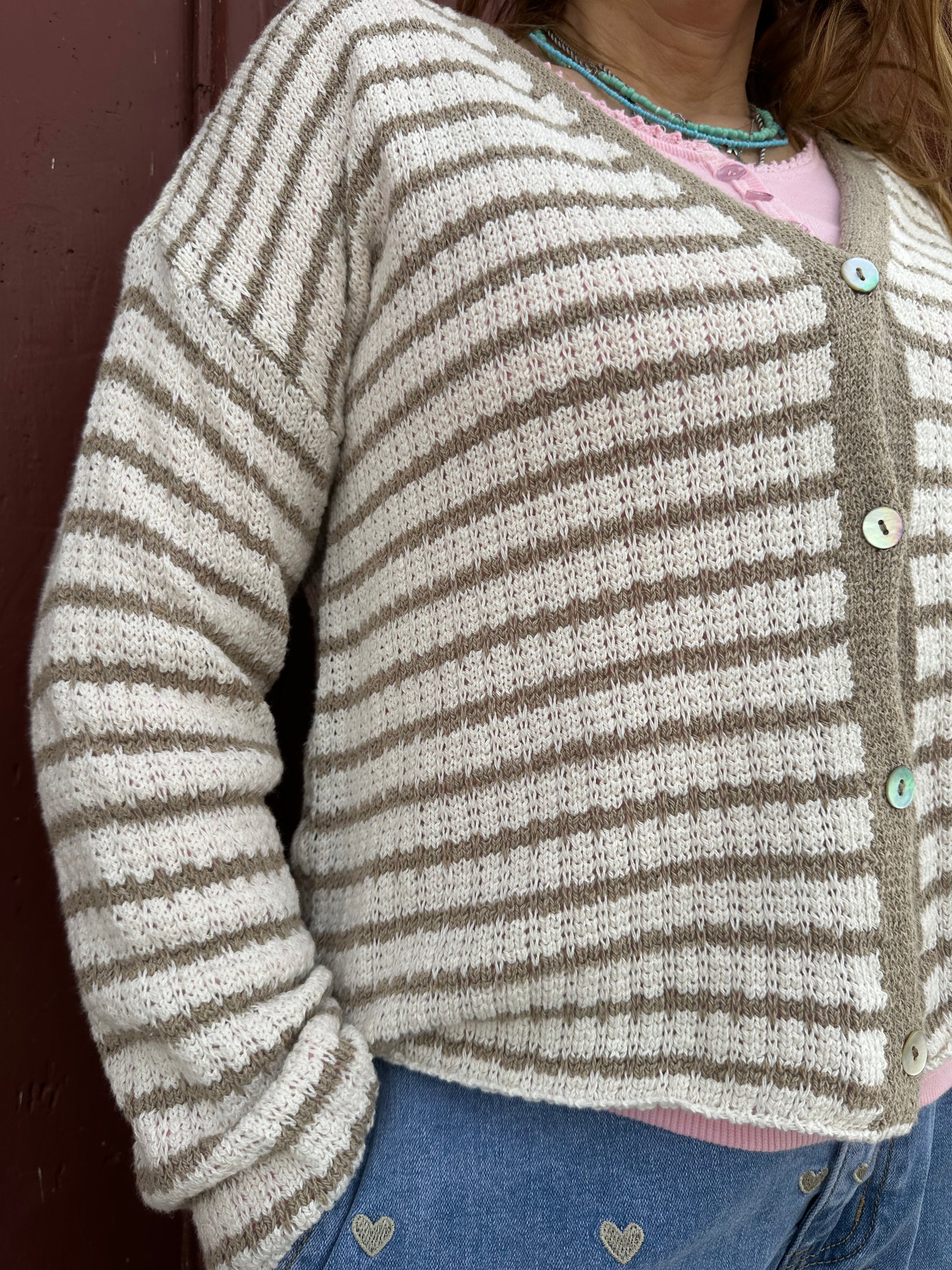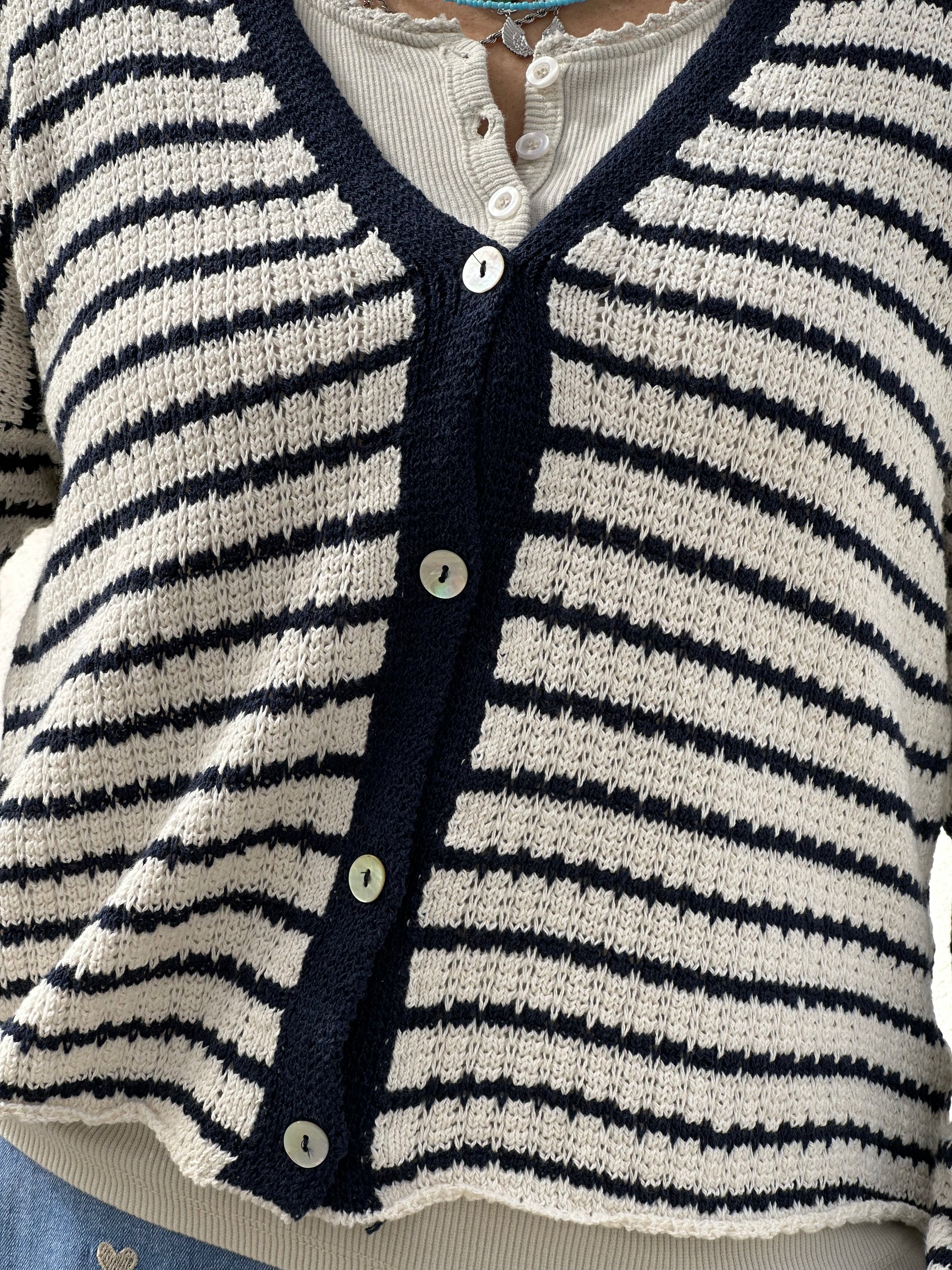 Cardigan de linha de algodão. Às riscas. Tamanho único.