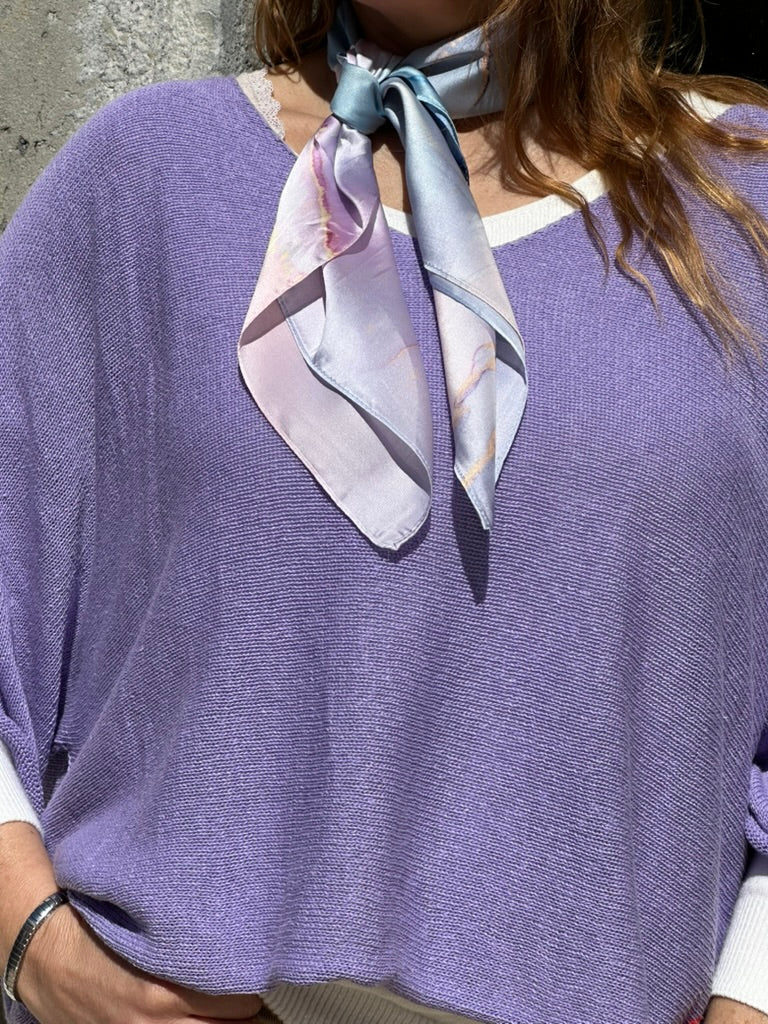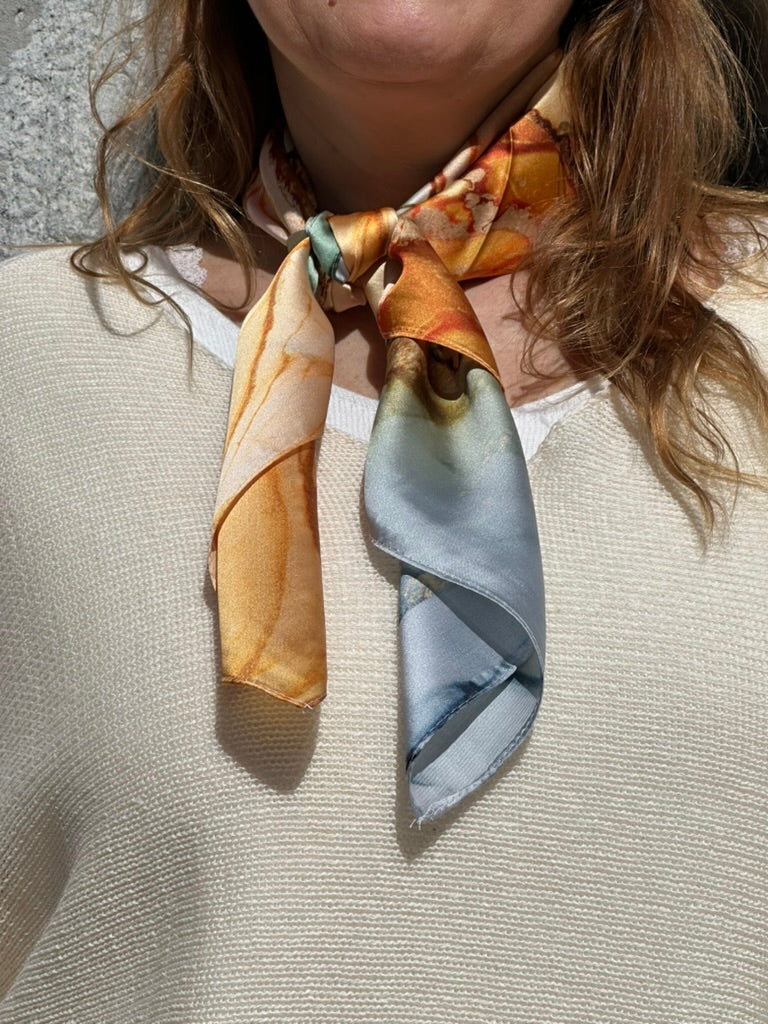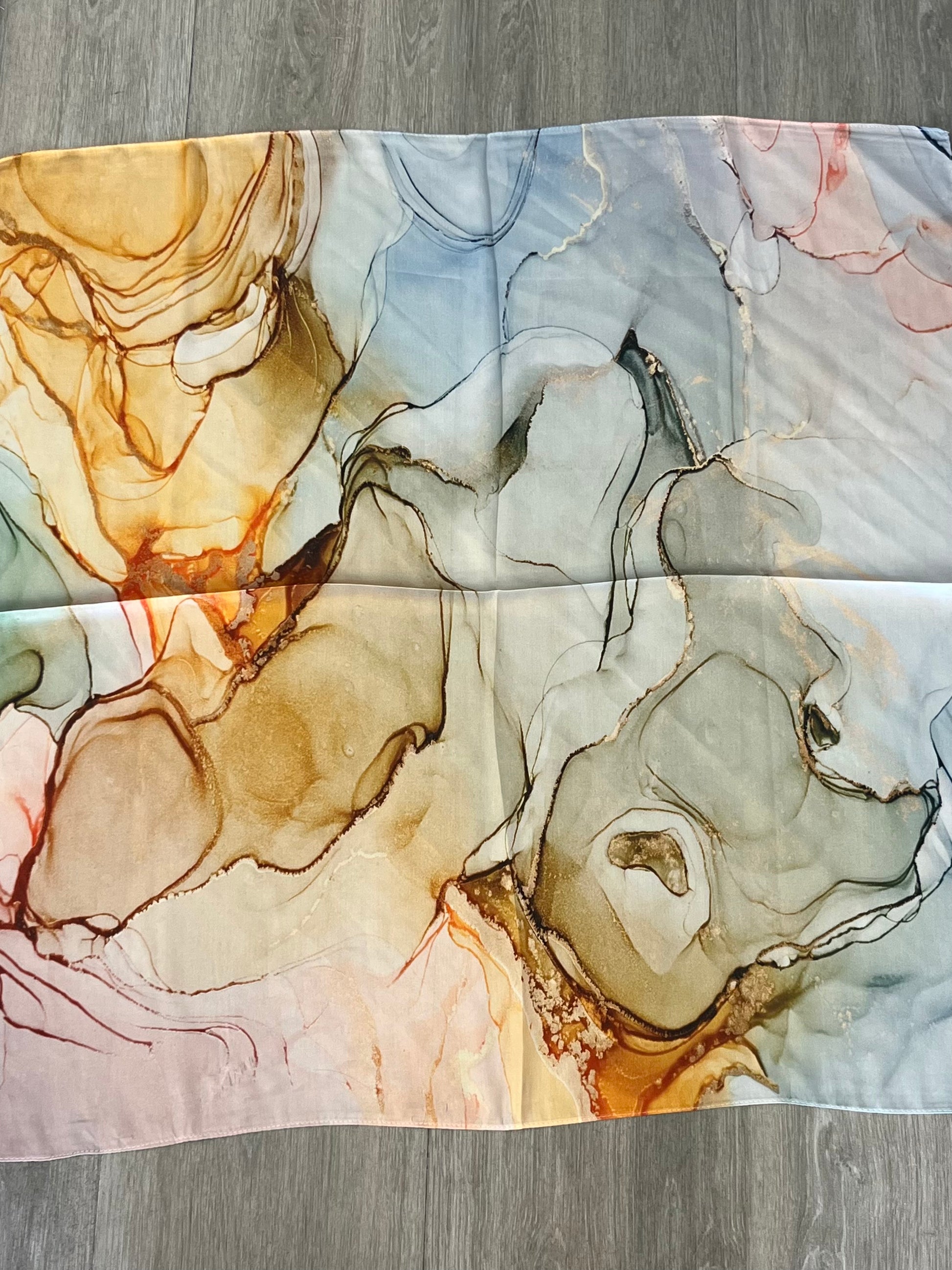 Lenço com padrão marmorizado suave. Ideal para meia-estação, tecido de cetim, leve e fluído.