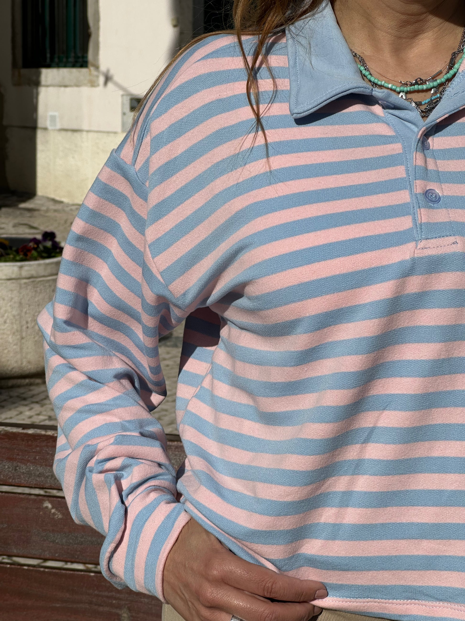 Polo às ricas com gola e 3 botões. Tamanho único.
